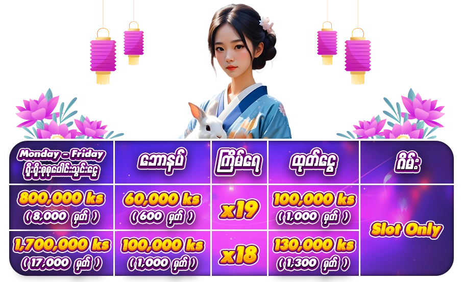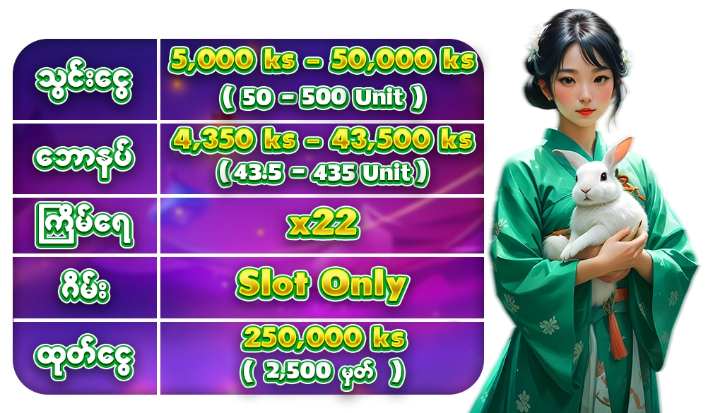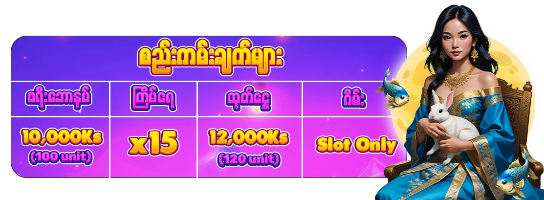 🌟 New Member အေကာင့္စဖြင့္ၿပီး စုစုေပါင္းသြင္းေငြ 3000 က်ပ္ (30 မွတ္ )ျပည့္ပါက Customer Service ကိုဆက္သြယ္ၿပီး ဖရီး FC အႀကိမ္ 20 လွည့္ႏိုင္မည္။ (ဤပ႐ိုမိုးရွင္းစတင္သည့္ 12/09/2025 မွ စသြင္းသည့္သြင္းေငြကို သာတြက္ေပးမည္)