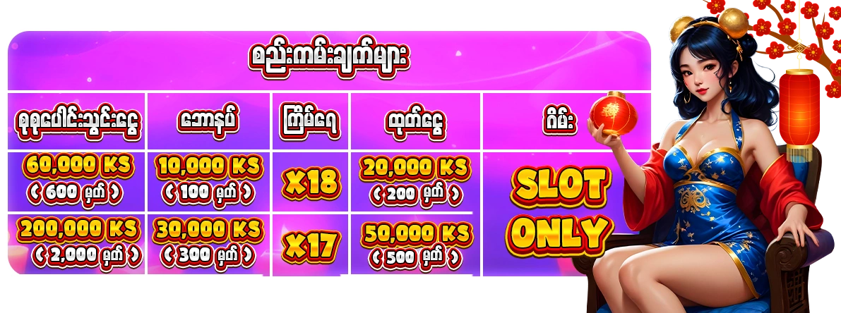 ⚠️ အကယ္၍ ကန႔္သတ္ထားတဲ့ SLOT မကစားဘဲ့ တစ္ျခားဂိမ္းမ်ားသြားကစားျဖစ္ပါက စစ္ေဆးေတြ႕ရင္ ေငြထုတ္ခ်ိန္တြင္ အရင္းမွတ္ သာလွ်င္ထုတ္ေပးပါမည္။ ⚠️