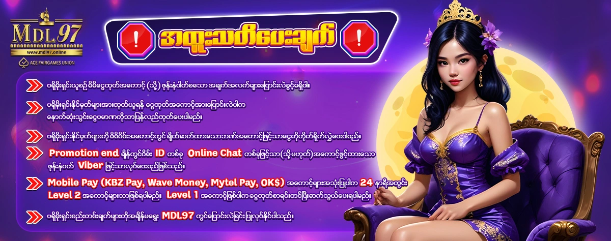 ⚠️အေၾကာင္းအမ်ိဳးမ်ိဳးေၾကာင့္ Promtion ႏိုင္ေငြအားေငြထုတ္ခ်ိန္တြင္ ေငြထုတ္ပယ္ဖ်က္ခံရပါက MDL97 Customer Service သို႔ဆက္သြယ္အေၾကာင္းၾကားေပးရမည္။ မဆက္သြယ္ဘဲ ပ႐ိုမိုးရွင္းႏိုင္မွတ္ျဖင့္ဆက္ကစားၿပီး ေငြထုတ္ပါက Promotion end ခ်ိန္ရွိသည့္အမွတ္သာထုတ္ေပးမည္။