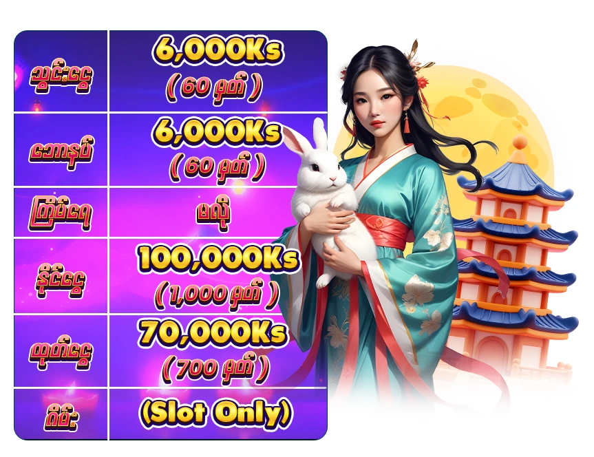 A အေကာင့္တစ္ရက္မွာ စုစုေပါင္း သြင္းေငြ 60,000 ( 600 မွတ္ ) ႏွင့္ အထက္ Slot ႀကိမ္ေရ 1,200 ျပည့္ရင္ ဖရီး 10,000 ရမည္