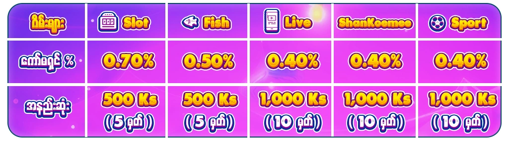🌟 ကစားလို႔ရမယ္ ဂိမ္းေတြကေတာ့ * JDB / FC / OMG / PS / RSG / YB (Slot Only) * မွကစားႏိုင္ပါသည္။